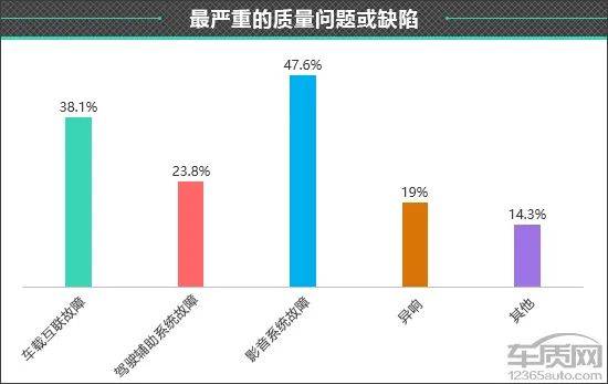 在对车主的进一步调查中我们发现,车身附件及电器出现非人为故障的占比相对较高,这也体现在“这款车最严重的质量问题或缺陷”调查结果中。经调查发现,车主对于2024款吉利银河E8在“影音系统故障”方面的抱怨较多,占比为47.6%。