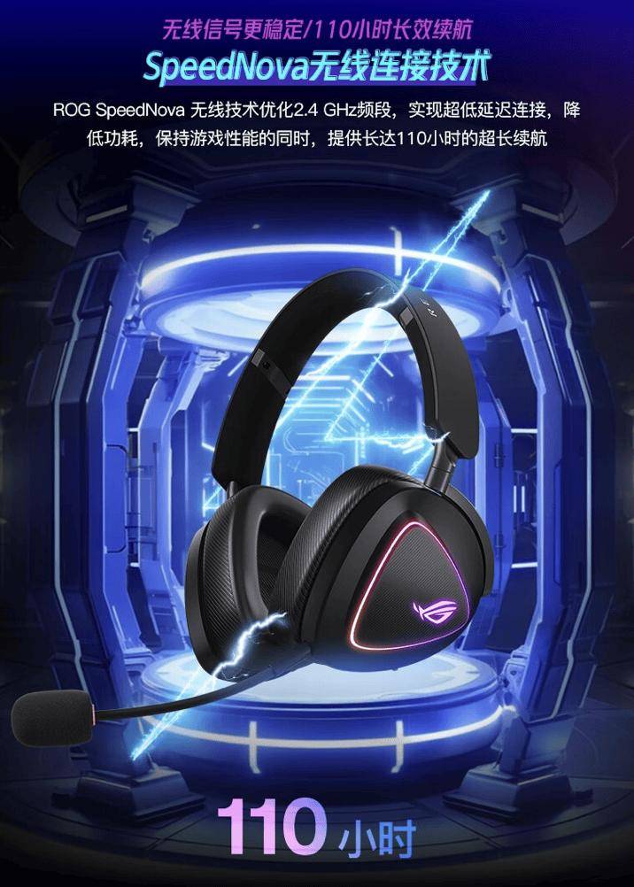 此外,获悉这款耳机续航 110 小时;支持 AuraSync 神光同步及华硕 SpeedNova 无线连接技术。
