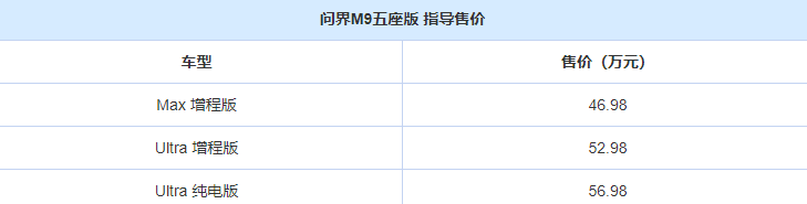 就在昨天,问界M9五座版迎来了正式上市!据悉,新车共推出了三款车型,售价区间为46.98-56.98万元。如果有感兴趣的小伙伴,可以来了解一下。