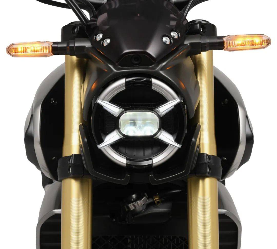 仿生学远近光分体式LED灯组、5寸投屏圆形TFT仪表、无钥匙启动、双通道ABS+TCS、胎压监测。