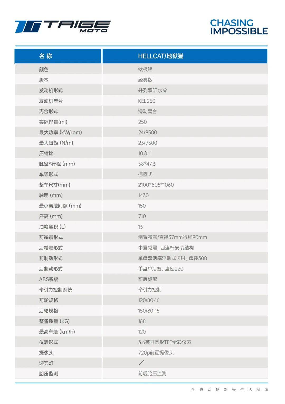 全系标配USB充电口,HELLCAT 250采用SAFE赛福前后双通道ABS,远近灯透镜大灯。标配TCS、把手加热、前后胎压监测,内置720P前置摄像头,3.54吋圆形TFT仪表,可实现手机箭头投屏导航。