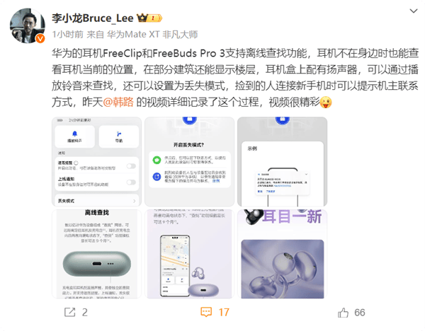 华为终端BG CTO李小龙转发视频并表示,“好神奇的经历,遗落的耳机失而复得,用华为FreeClip耳机的用户别忘了打开离线查找功能。”