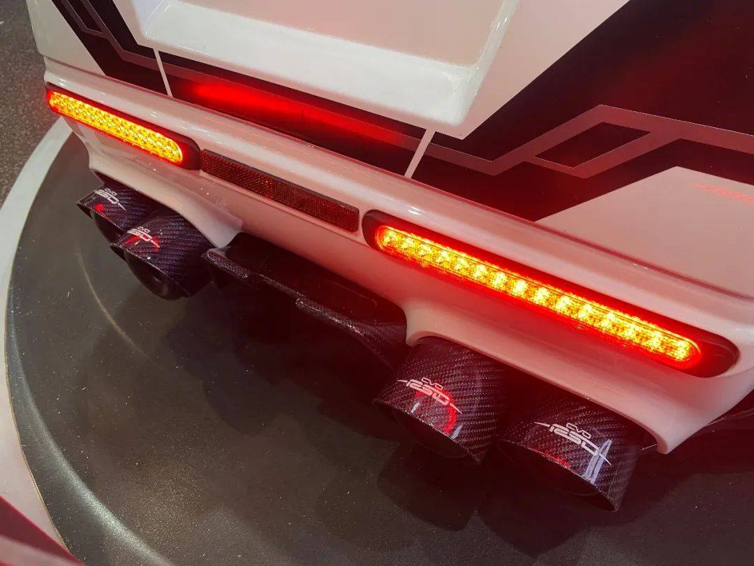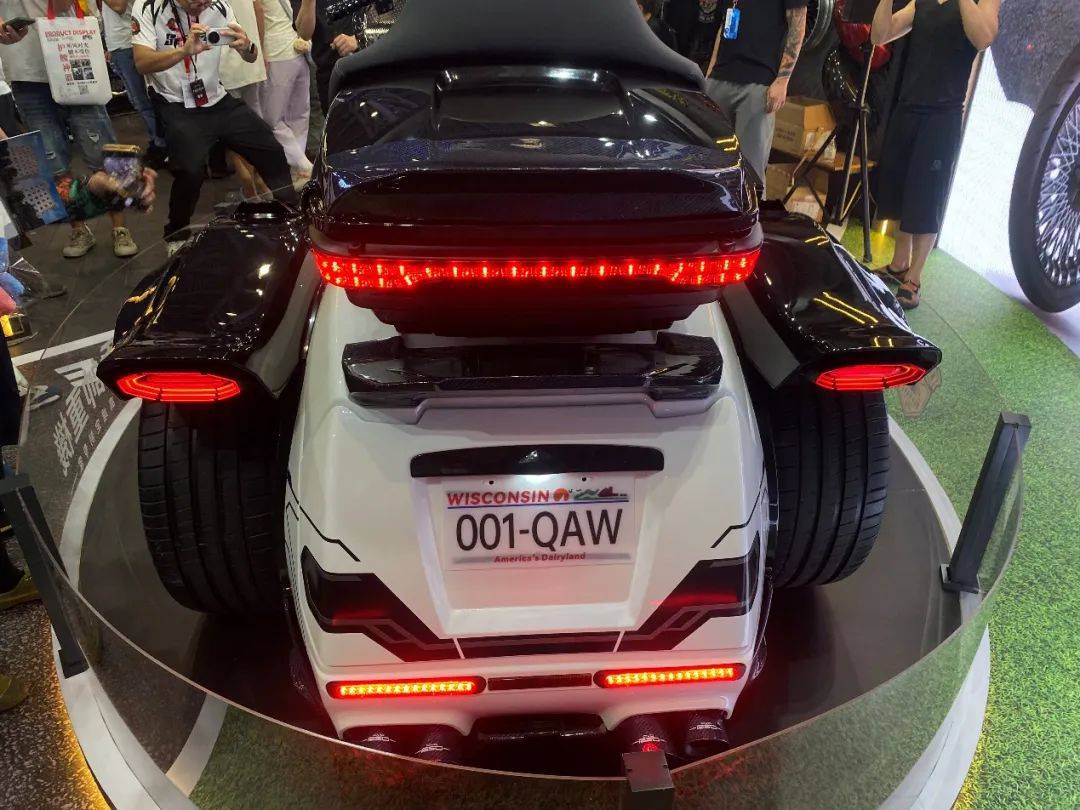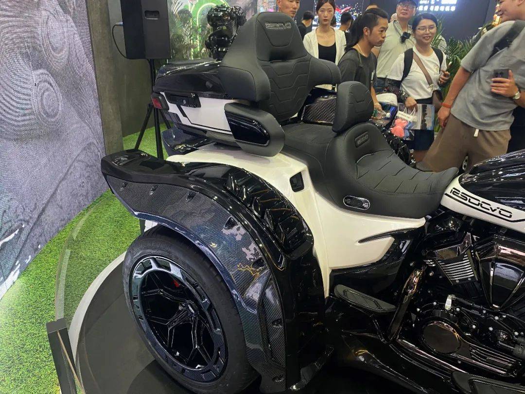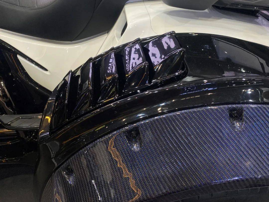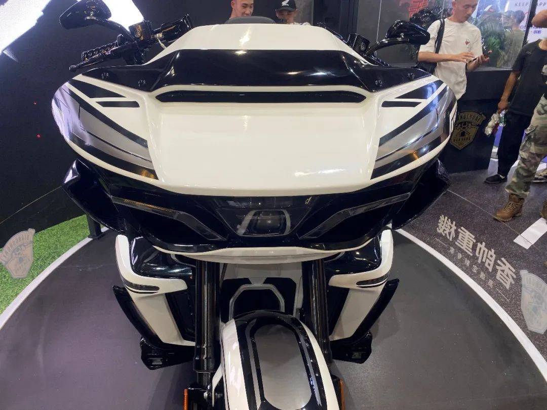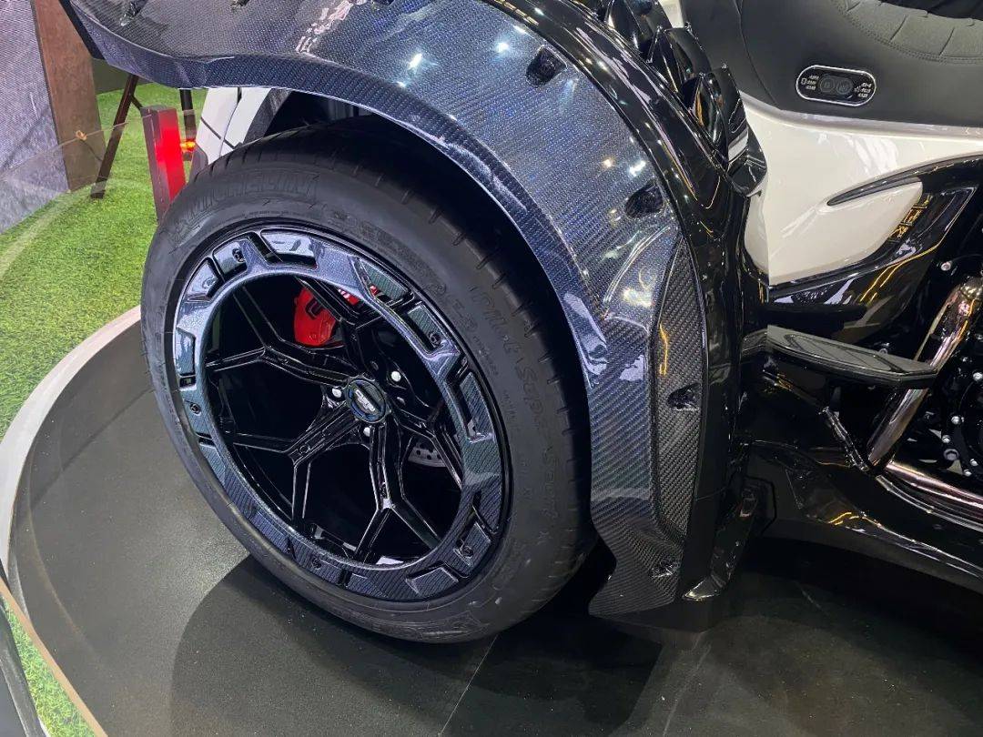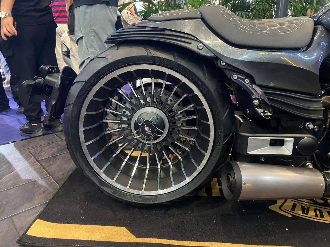 硕大无比的前脸造型颇具美式巡航风格,但同时细节上也能看出非常具有个性的创意。从正面看,鲨鱼鼻整流罩有些许中式战甲和国粹脸谱的影子,好似东江武将。相比前脸,车身尾部更是显得孔武有力,两个汽车级轮毂搭配上全碳挡泥瓦,表面还做出鲨鱼鳍的造型,这让“无双“吸引了所有观众的目光。