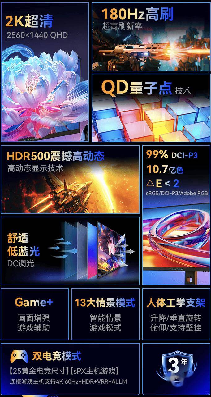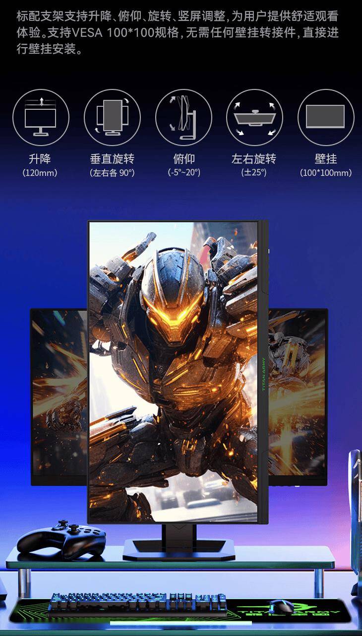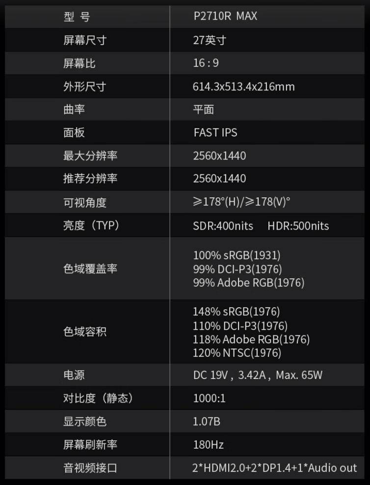 据介绍,这款显示器采用2560x1440分辨率180Hz Fast-IPS面板,亮度500尼特,静态对比度1000:1,支持8-Bit色彩,覆盖100% sRGB、99% DCI-P3、99% Adobe RGB色域。