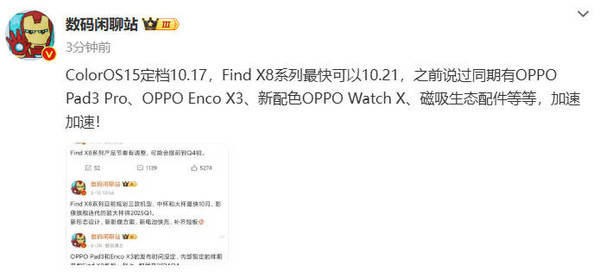 9月19日,知名爆料人士数码闲聊站透露,OPPO下一代旗舰OPPO Find X8系列最快将于10月21日正式发布,同期产品有OPPO Pad 3 Pro旗舰级平板、OPPO Enco X3真无线蓝牙耳机、全新配色的OPPO Watch X智能手表,以及多款磁吸生态配件,包括磁吸式充电宝等等。预计以上新品可能会在一场发布会上亮相。