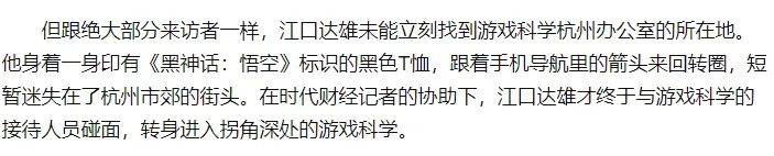 8月底,索尼互动娱乐(SIE)上海总裁江口达雄曾前往游戏科学拜访。可能由于游戏科学所在园区过于曲径通幽,江口达雄一时也没找到该怎么走,还是在媒体指路下才找到办公楼。