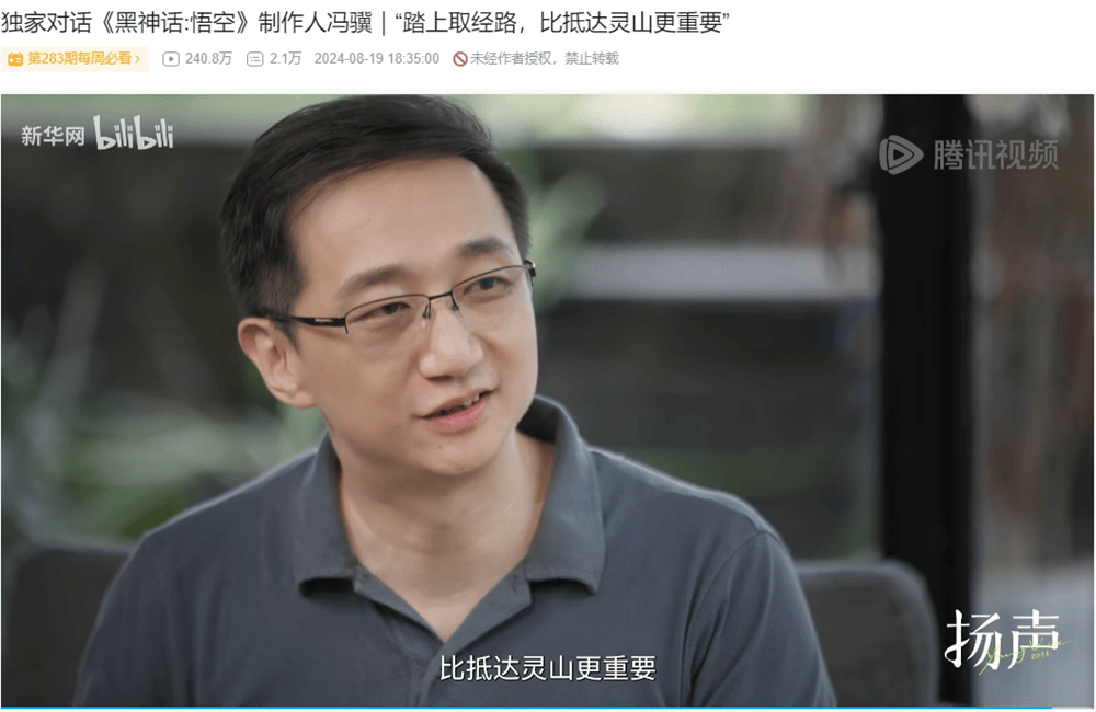 随后的冯骥专访中,冯骥一路回顾了《黑神话》从立项到一步步走到冲刺发售的历程,谈起了游戏中一些有意思的设计细节,如加入陕北说书的桥段,更是说出了那句“踏上取经路,比抵达灵山更重要”的励志名言。