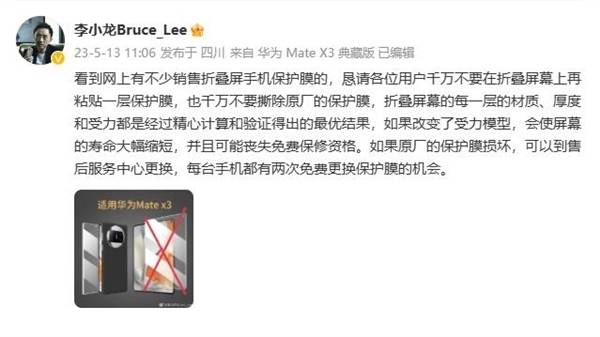 华为高管、终端BG CTO李小龙曾表示,折叠屏幕的每一层的材质、厚度和受力都是经过精心计算和验证得出的最优结果,如果改变了受力模型,会使屏幕的寿命大幅缩短,并且可能丧失免费保修资格。