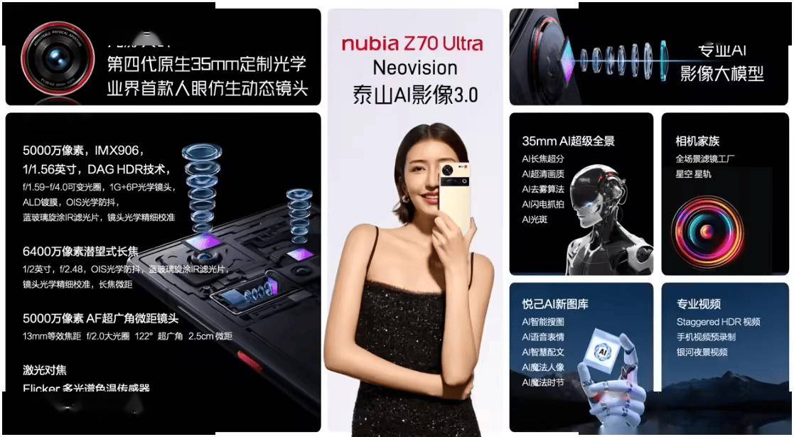 据介绍,努比亚 Z70 Ultra 手机搭载全新星辰大模型,包括 30 亿参数端侧大模型 + 千亿参数云侧大模型,组成了自然语言、语音、影像、视觉、性能、多模态等多个大模型矩阵。