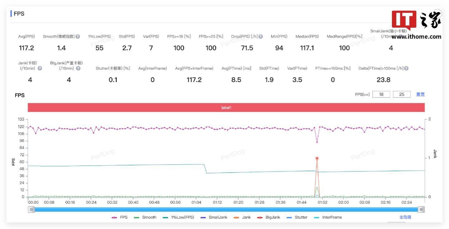 如下图,实测《原神》到达了 117.2fps,相较于游戏最高的 60 帧,“超境画质”让游戏流畅度直接提高了一倍。