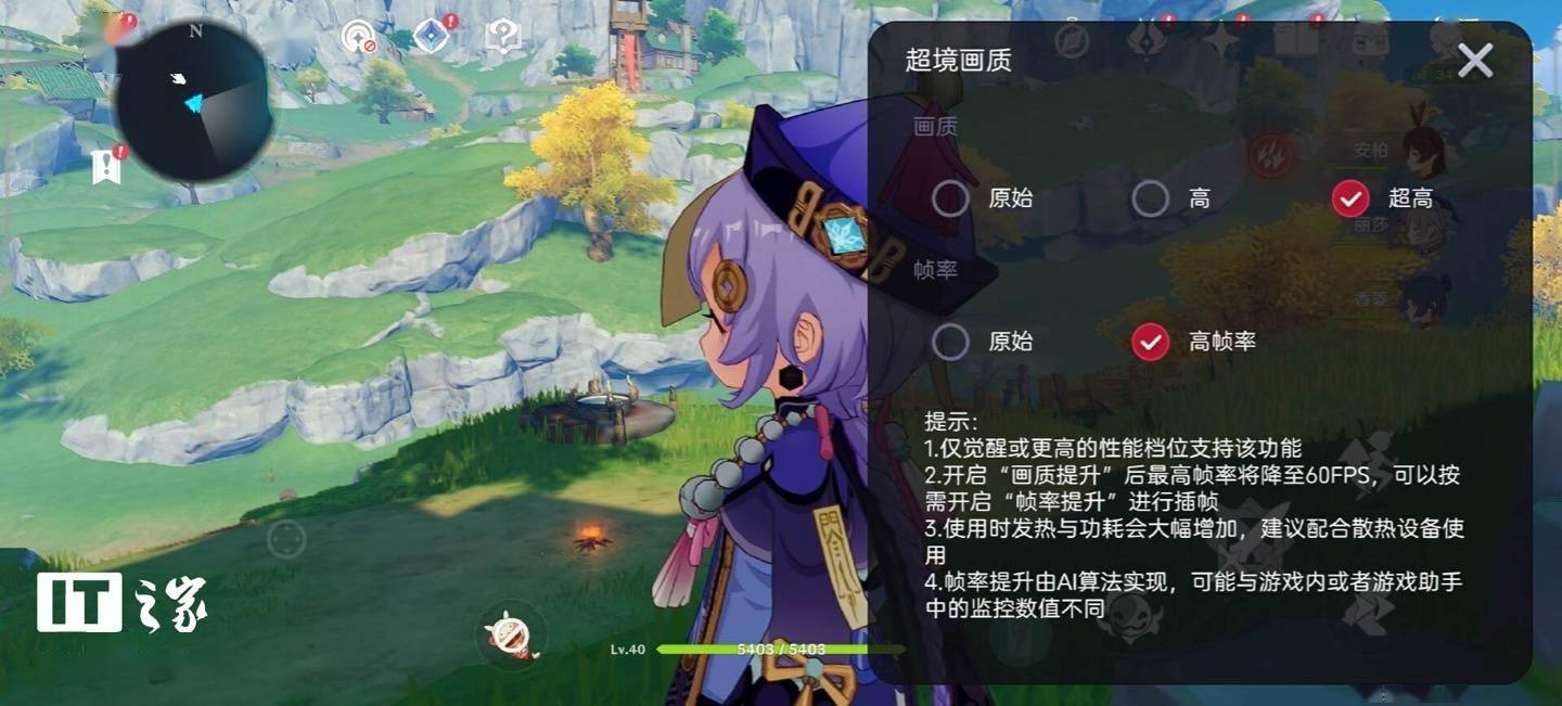 在“觉醒模式下”,还可以选择“超境画质”,开启超越游戏原生 60 帧的高帧率体验 —— 到达了 120 帧,同时必须强调的是,这是实打实的原生 120 帧,是能够测出来的原生 120 帧率。