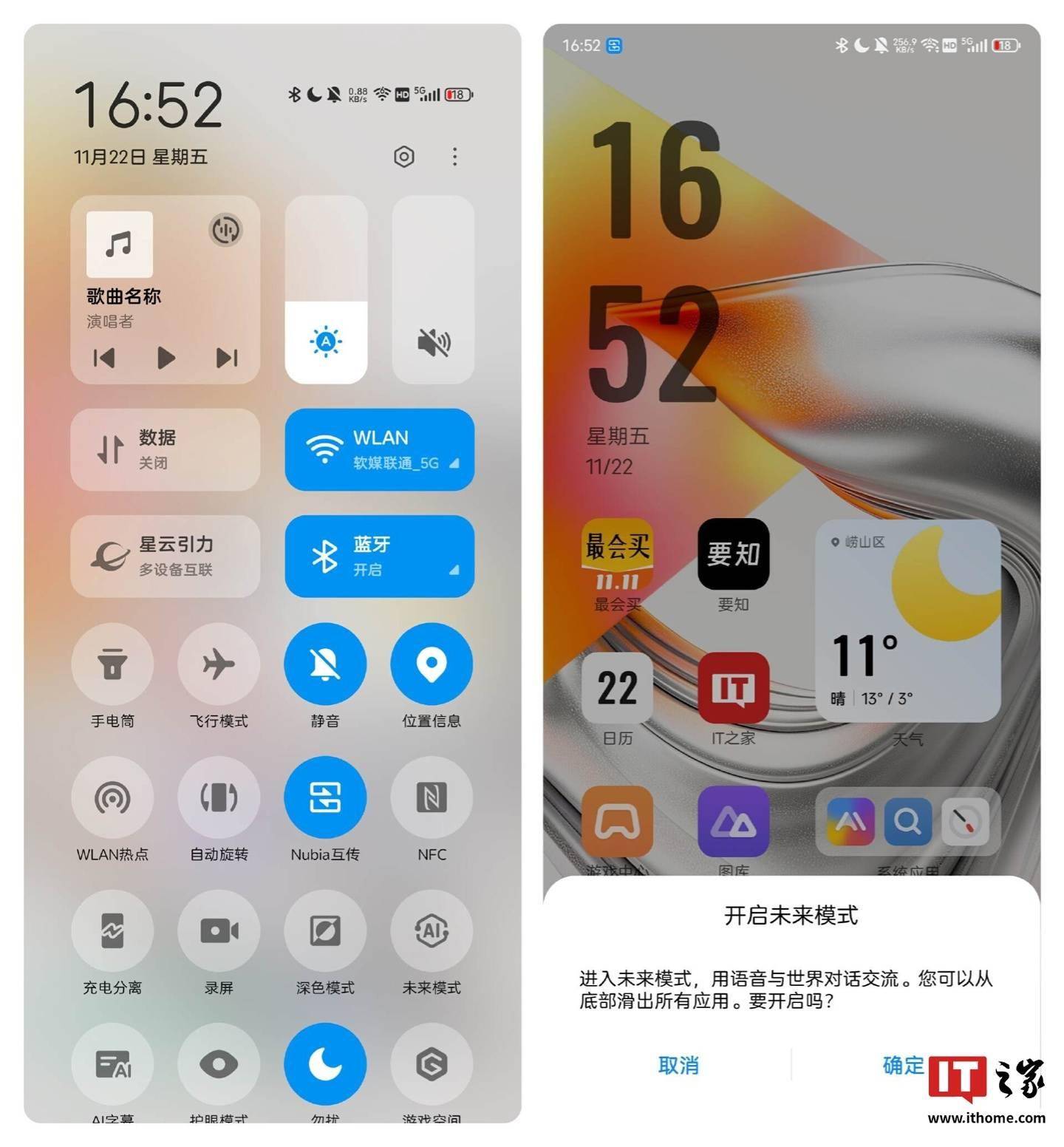 开启“未来模式”很简单,右侧下拉栏中开启“未来模式”;或者设置-桌面-桌面模式,选择“未来模式”;甚至长按电源键语音开启“未来模式”。