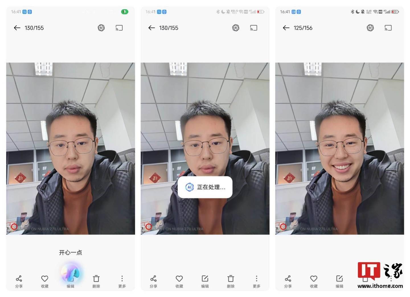 努比亚 Z70 Ultra 还有个很有趣的功能是 AI 魔法人像,比如相册中打开人像照片,并通过星云智能语音助手说出情绪指令,如“开心一点”或“我还是喜欢你高冷的样子”,照片中的人像会随之变化表情。