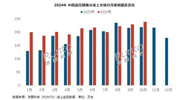 洛图科技(RUNTO)线上监测数据显示,监控摄像头在促销期(2024年10月14日-11月11日)的中国电商销量达到249万台,同比增长约15%。其预测,2024年全年,中国监控摄像头线上全渠道的销量将达2988万台,同比增长12%,其中传统电商为2512万台;整体市场的销量将达5600万台,同比增长约5%。