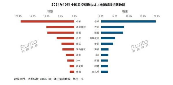 品牌格局方面,2024年10月,小米、乔安、萤石、海康威视在销量维度位居前四,合计份额(CR4)为41.1%,同比增长1.9个百分点,环比增长2.3个百分点。其中,小米拿下了销量和销售额的双冠军。
