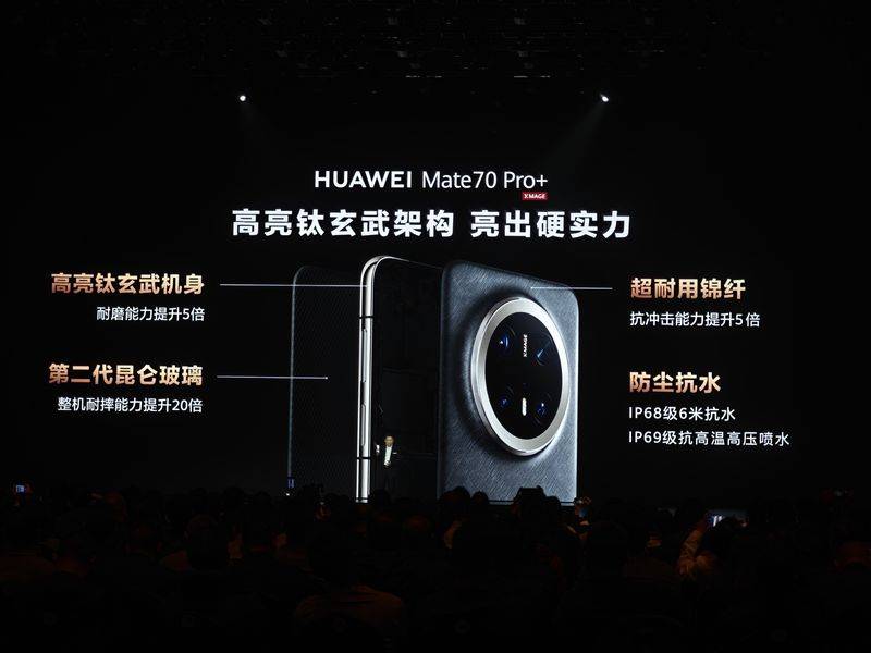 机身上首次采用了高亮钛玄武机身,使得抗摔性能提升了1倍,耐磨性提升了5倍。而机身背面则使用了超耐用的锦纤材料,其抗冲击能力提高了5倍,与第二代昆仑玻璃共同构成了全新的高亮钛玄武结构,同时支持IP68、IP69级别防尘防水。华为Mate70系列配备了5700mAh的大容量电池,并支持100W的有线快充以及80W的无线快充功能。