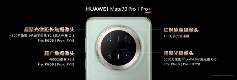 华为Mate 70系列在摄像头配置上颇为出色,其主摄像头搭载了5000万像素(具备f/1.4至f/4.0的可变光圈和光学防抖OIS)、4800万像素(4倍光学变焦,f/2.1光圈,OIS)的长焦摄像头以及4000万像素(f/2.2光圈,支持最短5cm对焦距离)的超广角摄像头。特别的是,Mate 70 Pro+的长焦和超广角摄像头均采用了RYYB传感器,而Pro版本则均为RGGB传感器。