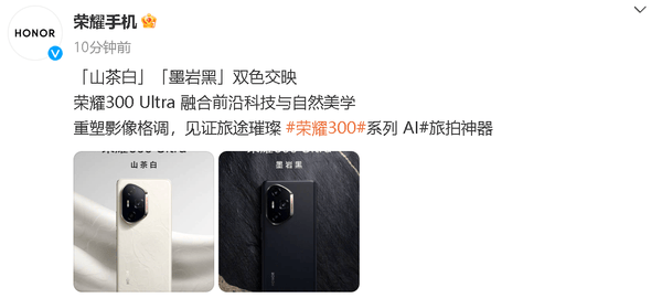 荣耀终端官方介绍荣耀300 Ultra称:“重塑影像格调,见证旅途璀璨,荣耀300系列AI旅拍神器”。可以看出,影像将是荣耀300 Ultra的一大亮点。