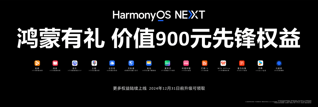 为进一步吸引用户升级到HarmonyOS NEXT,华为推出了总价值高达900元的“鸿蒙有礼”HarmonyOS NEXT先锋权益,包括华为视频、阅读、音乐、主题、云空间、天际通、钱包和爱奇艺、哔哩哔哩、芒果TV、WPS Office、喜马拉雅、优酷等应用的会员和活动权益,以及元服务优惠券等将陆续上线。在2024年12月31日前参与原生鸿蒙升级的用户,均可在“我的华为”APP内按指引轻松获取。