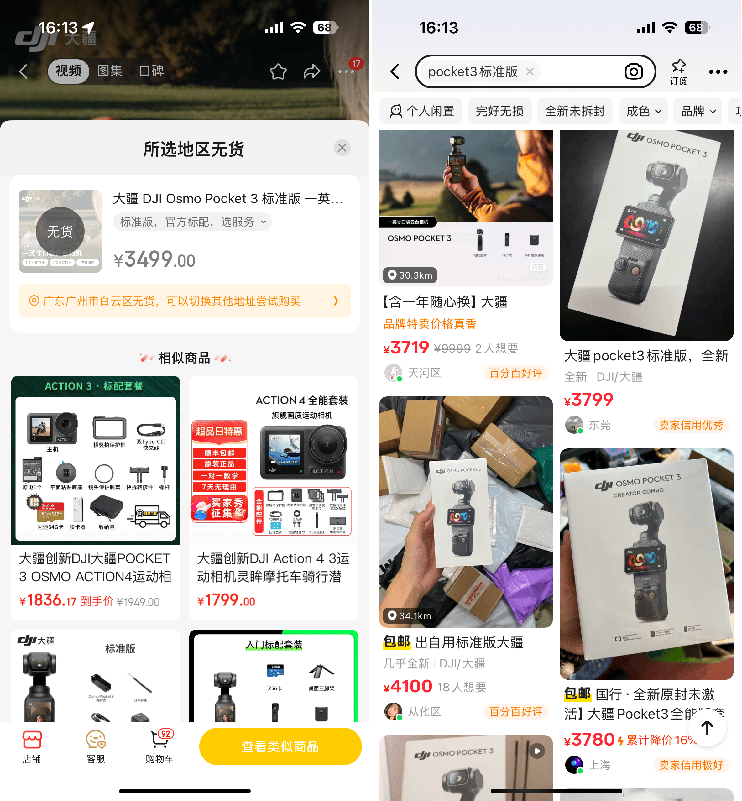 比如在京东,小雷购买大疆Pocket 3官方标准版时就直接提醒无货(广州),而在闲鱼,大疆Pocket 3官方标准版的售价则比官方价格高出了几百元。