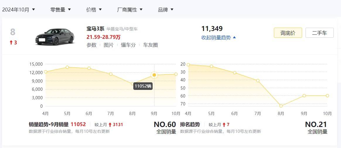 销量方面,现款宝马3系近两个月的销量数据分别为11052辆、11349辆,整体也还是比较趋于平稳的这么一个销量势头。不过,目前现款宝马3系在终端的优惠很大,指导价29.99万元的新车,经销商最低报价已经来到了21万多,所以从一定程度上来说这也是“以价换量”的结果。