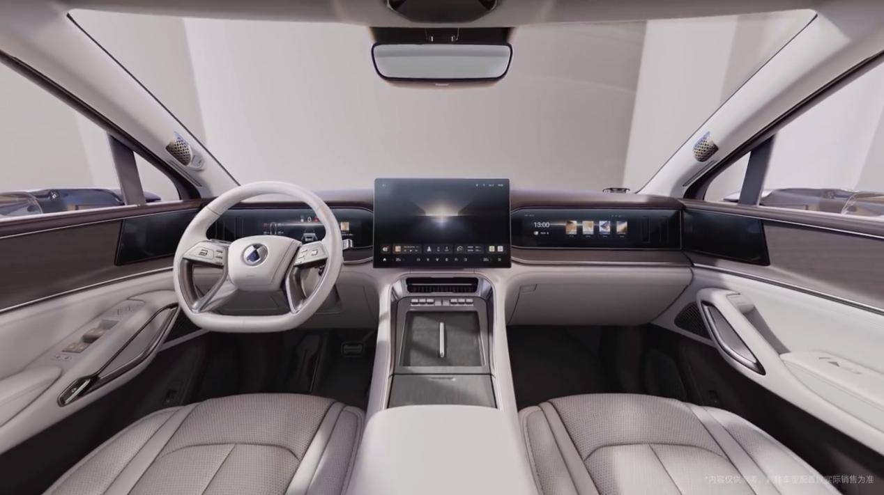 从内饰图片可以看到,布局与腾势Z9类似,左右两边是电子外后视镜的显示屏,然后还有13.2英寸液晶仪表和副驾娱乐屏以及17.3英寸悬浮式大屏。虽然一眼望去屏幕众多,但在中控部分保留了实体按键,采用了金属质感的拨杆设计,可以控制智驾功能,驾驶模式,动力模式等。另外,还可以看到双50W手机无线充电面板,以及四辐式多功能方向盘。