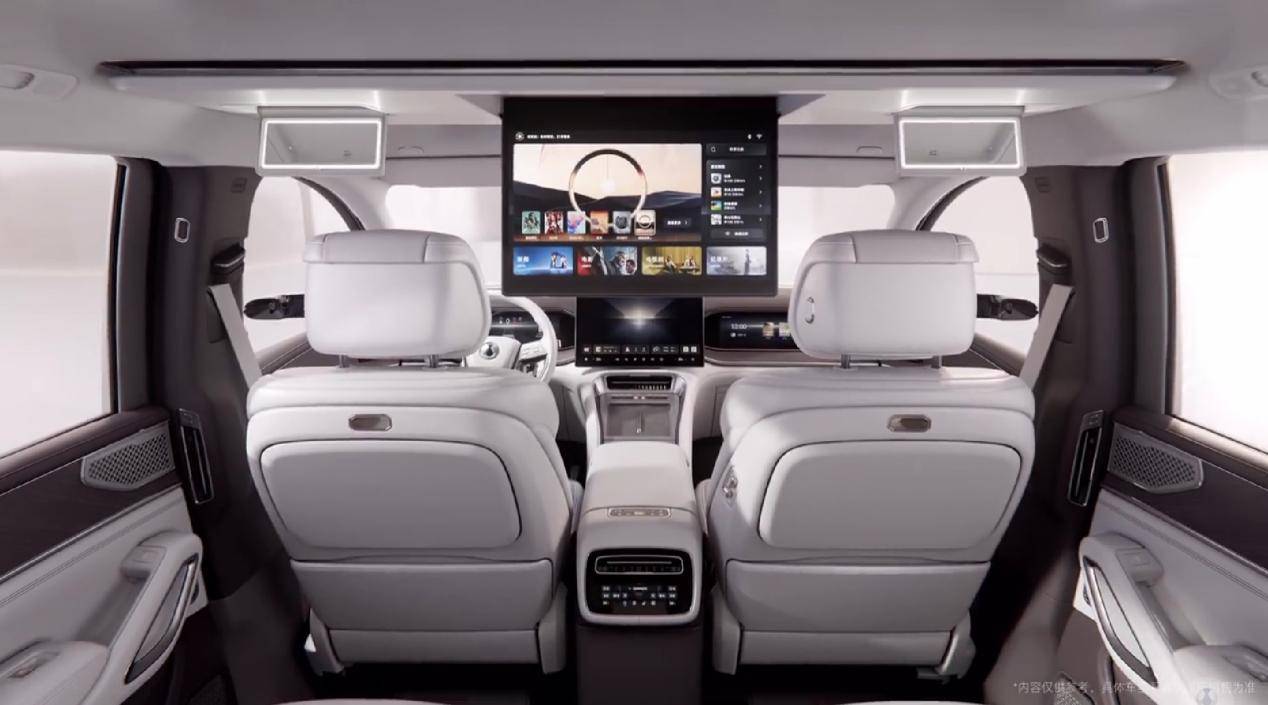座椅方面,腾势N9采用了2+2+2的6座布局,座椅看上去比较厚实,主驾座椅带有主动侧翼功能、副驾座椅提供四向女王腿托。不过第二排才是全车的VIP,不仅有17.3英寸的后排吸顶屏和双桌板,在第二排左右两个位置的顶部还设置了带补光灯的化妆镜,另外还有带压缩机的车载冰箱,温度可调范围是-6°C-50°C,位置在中央扶手箱处,为上下两层设计,下层为抽屉式,可在第二排拉开。