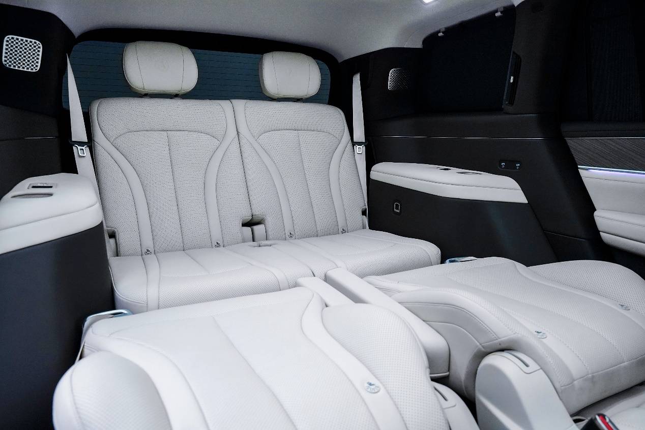 另外,腾势N9还采用了两端式天窗设计,后半部分为全景天幕,一直延伸到了第三排。作为大型SUV第三排的腿部和头部空间都是比较有保障的,但坐垫高度往往并不理想,而腾势N9的第三排坐垫设计了高度可调功能能够尽可能的让第三排乘客坐得舒适。
