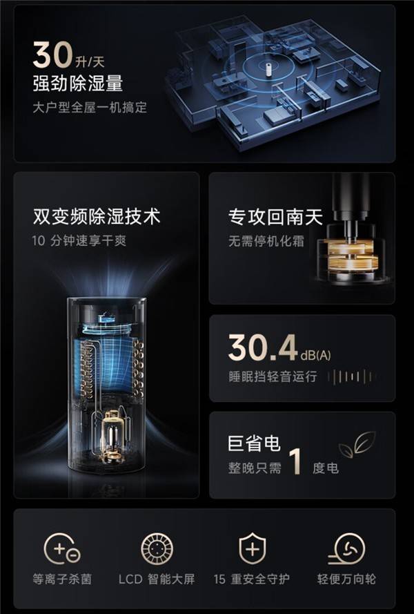 内部搭载松下双转子变频压缩机,单间除湿面积60平方米,一天除湿量可达30升,约等于一天从空气中抽出6桶5升桶装水。在睡眠档下噪音约30.4dB,整晚仅需1度电。值得注意的是,在湿冷的回南天,传统定频除湿机易结霜停机影响除湿效果,双变频技术能精准控制蒸发器温度实现稳定除湿且不结霜。内置等离子发生器,配合细密银离子滤网,阻隔空气中大颗粒污染物,减少细菌滋生造成的二次污染。