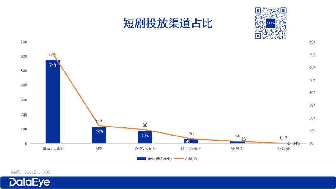 11月短剧投放渠道中,抖音小程序位列第一,APP第三,微信小程序第三,快手小程序和快应用分别是第四和第五。