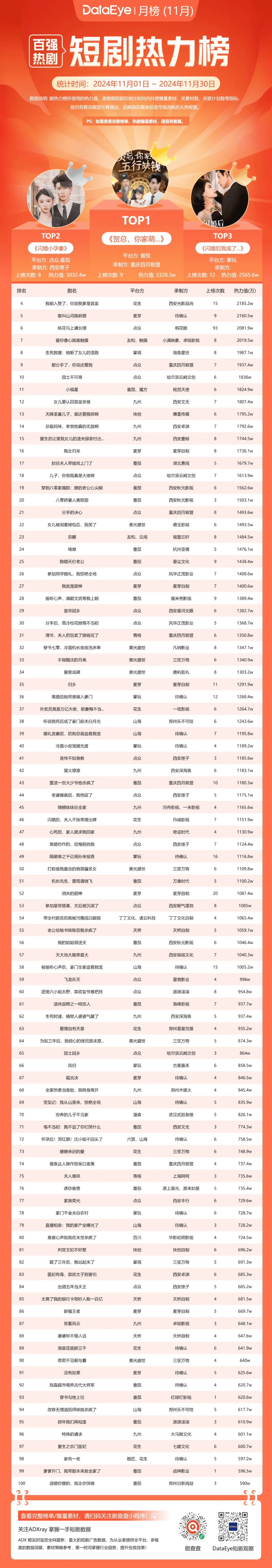 2、11月男频/女频热投短剧TOP20:萌宝题材热度上涨,老剧热度居高不下
