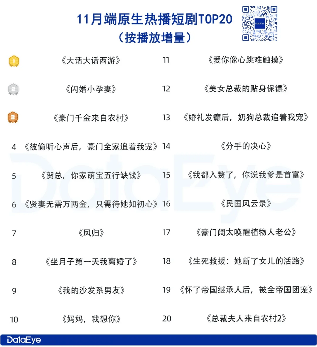11月DataEye端原生热播新品榜中,九五二七剧场播出的《大话大话西游》登顶,成竹剧院播出的《豪门千金来自农村》第二,木兰短剧的《贺总,你家萌宝五行缺钱》第三。
