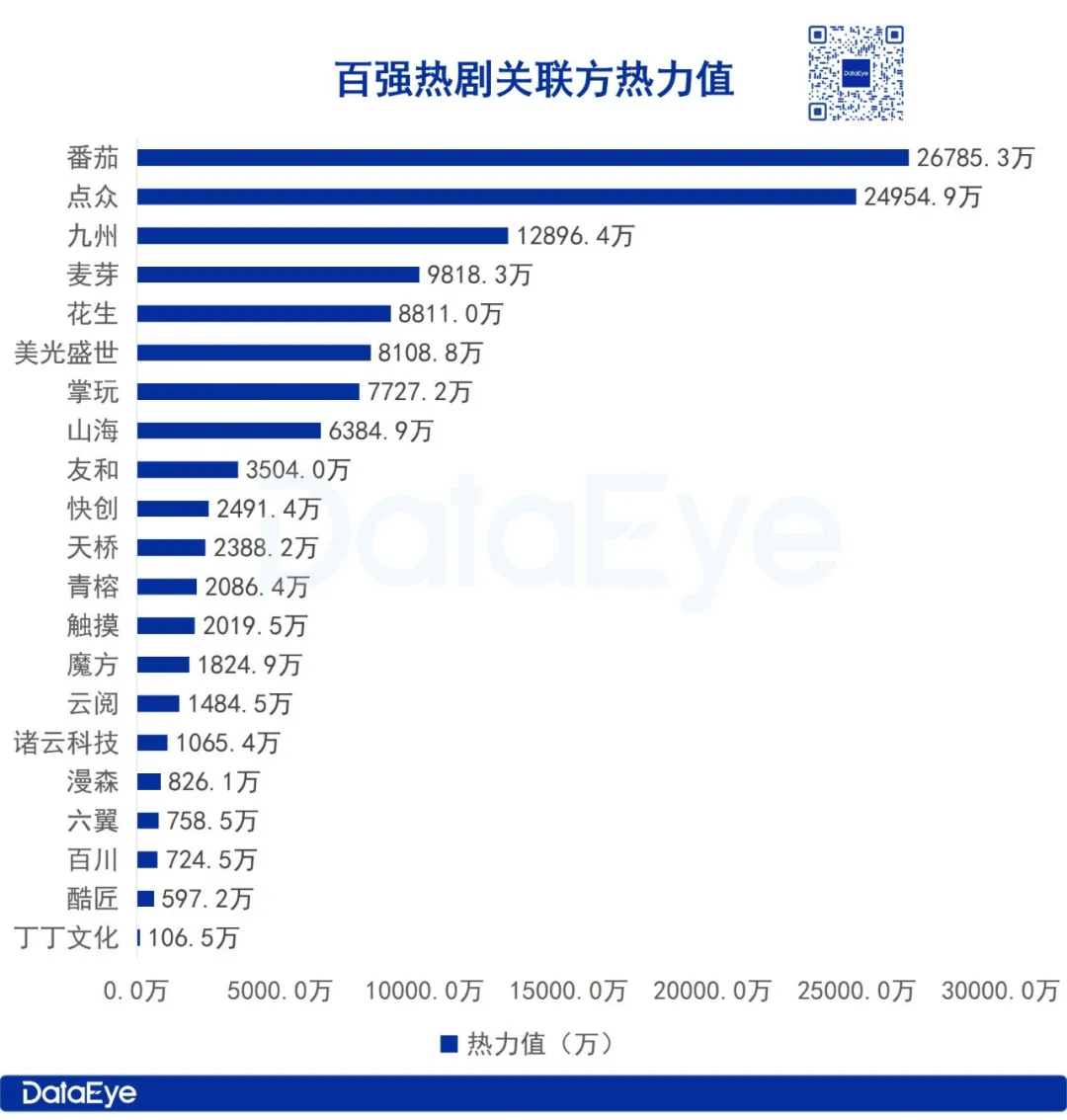 其中番茄和点众关联热力值大幅领先,分别为2.7亿和2.5亿,九州为1.3亿。共有13家公司关联热力值超1000W。