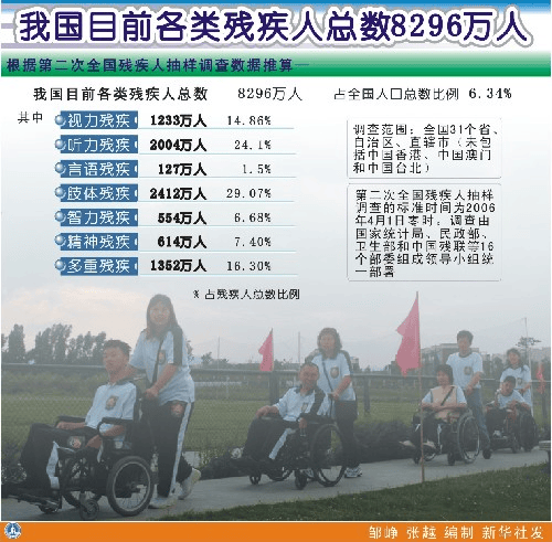 2006年的抽样调查数据推算,我国各类残疾人总数为8296万人,占全国人口总数6.34%。