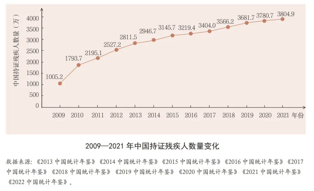 截至2022年底,中国残疾人人口基础数据库有持证残疾人3768.166万,比2010年增加了近1000万。
