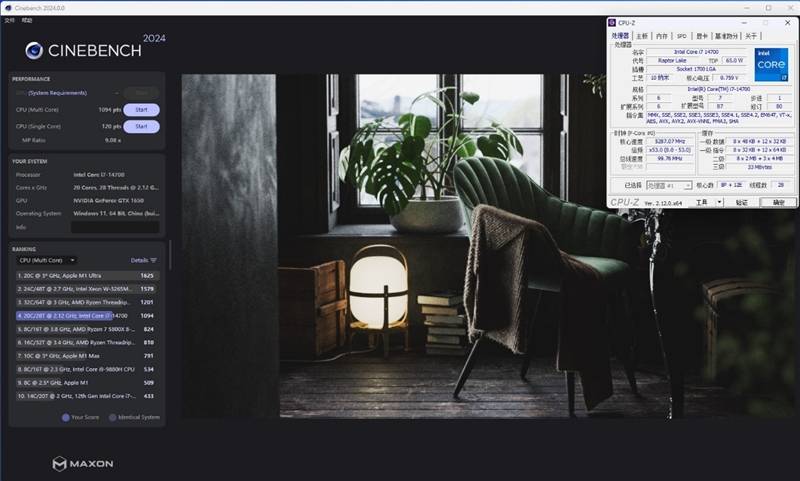 i7-14700单线程分数120pts,多线程分数1094pts。