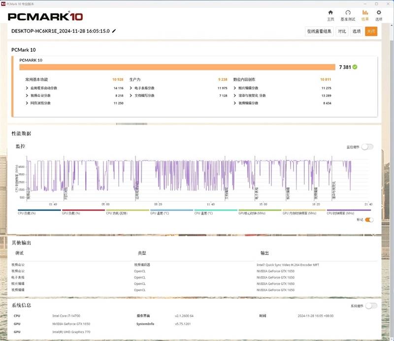 i7-14700整机分数7381,略低于锐龙7 8700G,其中常用基本功能为10928分、生产力9238分、数位创作7381分。