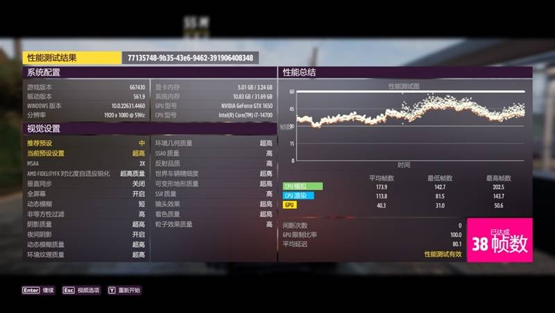 GTX 1650 D5显示显存容量为3.24GB,实际使用5.01GB,已经出现了爆显存的情况,游戏帧率38FPS。