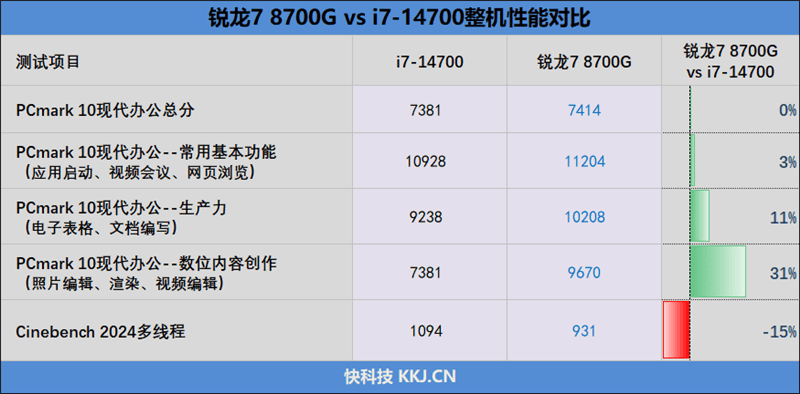 在展示整机商用性能的PCMark 10现代办公测试中,不论是总分还是网页浏览、生产力以及视频创作,锐龙7 8700G都小胜i7-14700,后者只在CineBench 2024项目上稍微挽回了一些颓势。