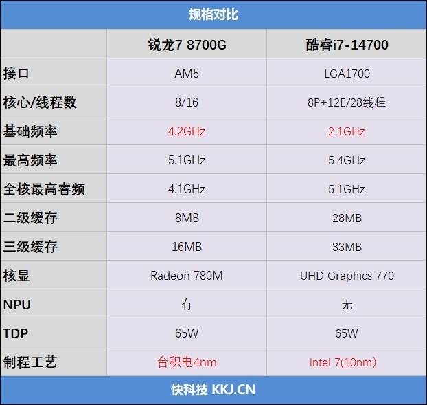 因此,锐龙7 8700G拥有更优秀的能效比,基础频率能达到4.2GHz,而i7-14700的基础频率只有2.1GHz。
