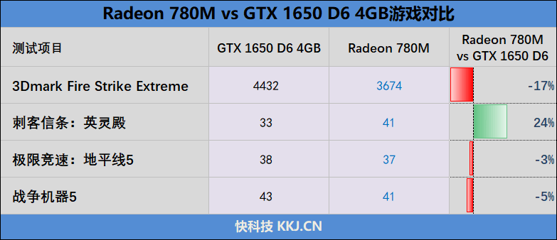 从测试成绩来看,虽然在3Dmark Fire Strike Extreme中GTX 1650 D6的分数比Radeon 780M强了不少,但是实际游戏中,却并未能取得优势。