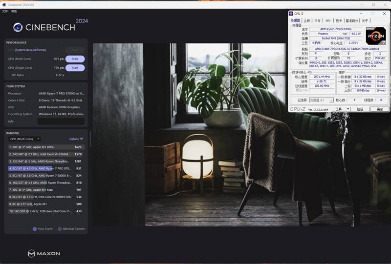 在CineBench 2024测试中,锐龙7 8700G单线程分数106pts,多线程分数931pts。