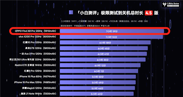 小白测评公布的续航测试显示,搭载天玑9400的OPPO Find X8 Pro续航时间接近8小时,比苹果iPhone 16 Pro Max多出2小时以上。