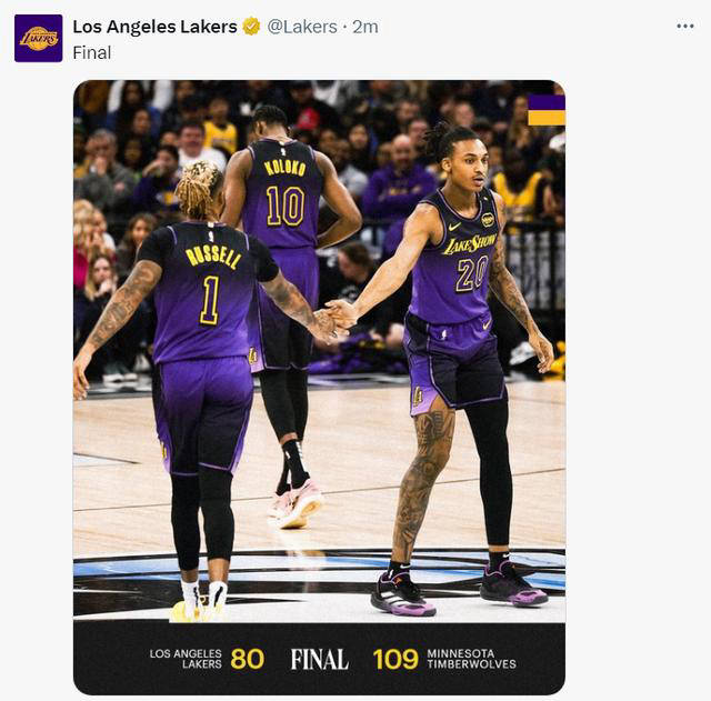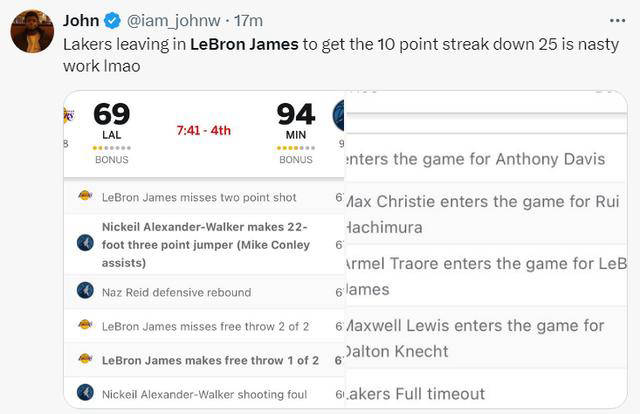 湖人80-109惨败森林狼,背靠背第二场提前认输,詹姆斯与戴织的表现大受质疑,詹姆斯出战31分钟,投篮16中4三分4中0,取得10分8篮板4助攻6失误,命中率仅为25%,真实命中率28.2%,正负值-28。他的表现引发了广泛关注。