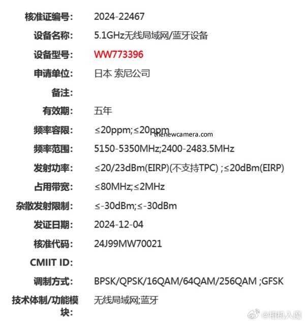 信息显示,索尼新机代号WW 773396,申请单位为日本索尼公司,发证日期12月4日,大概率为索尼A7 V。