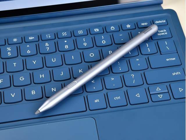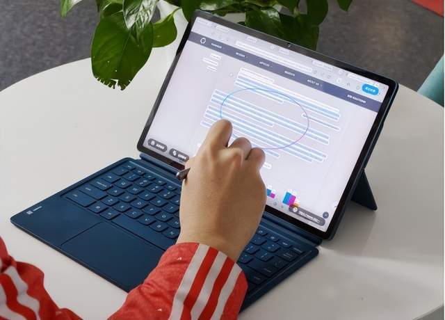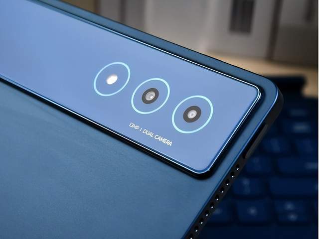 下图可以看到,YOGA Pad Pro AI元启版横置连接键盘时,机身内置的6颗哈曼卡顿联合调音的超线性扬声器能带来澎湃的立体声音效果,定向拾音更加精准,搭配1300万像素超广角前摄开视频会议、上网课都清晰;后置1300万像素+微距双摄也方便用户拍下板书、会议内容,再搭配上手写笔一圈总结、一圈翻译,记笔记就是这么简单。