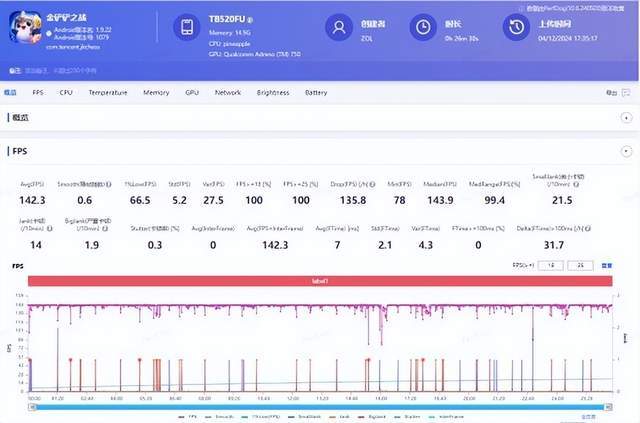 游戏实测环节中,为了更好发挥出大屏的优势,我们选择了《金铲铲之战》、进行帧率测试,屏幕的亮度调整为自动,测试环境为24℃的室温,游戏内帧率最高可以开到144FPS,帧率表现如下: