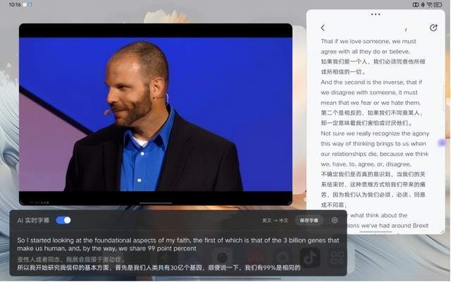 会议转录有多麻烦想必不用笔者多解释,外语会议转录更是难如登天,常常让人感觉脑子跟不上趟。不过,YOGA Pad Pro AI元启版 具备的 AI 实时字幕功能可轻松解决这一难题,它能在第一时间把语音精准转换为汉字,并且支持快速将转换后的内容保存到便签里,这样后续无论是进行总结还是润色,操作起来都极为便捷。