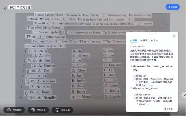 基于强大的算力,YOGA Pad Pro AI元启版也能实时解答用户的疑问,做个题也是轻轻松松。逼着随便拍了一篇侄子的完形填空题,按下手写笔按键点击识屏,再这么一圈,它不仅能给出原文翻译,还能根据前后文逻辑给出答案及解析,这学习效率不是夸夸提升。