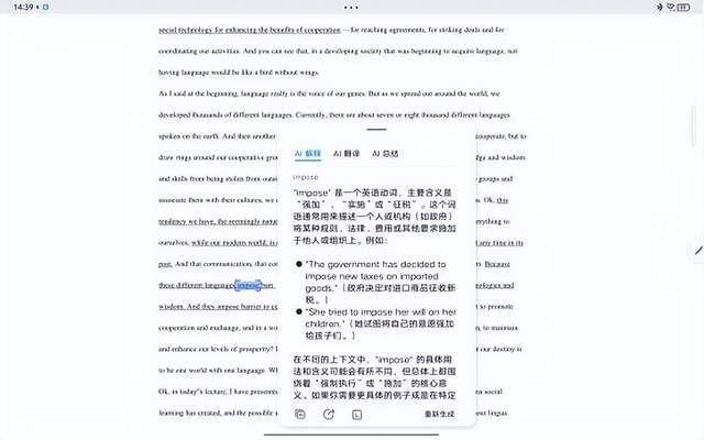 如果仅是不理解部分生僻词,YOGA Pad Pro AI元启版也提供了更便捷的翻译方式,只需把笔尖悬停在对应词汇上方,即可快速给出翻译,需要成段、成句翻译时,只需把勾选框拉大,就能进行更长内容的翻译总结,操作很符合直觉。